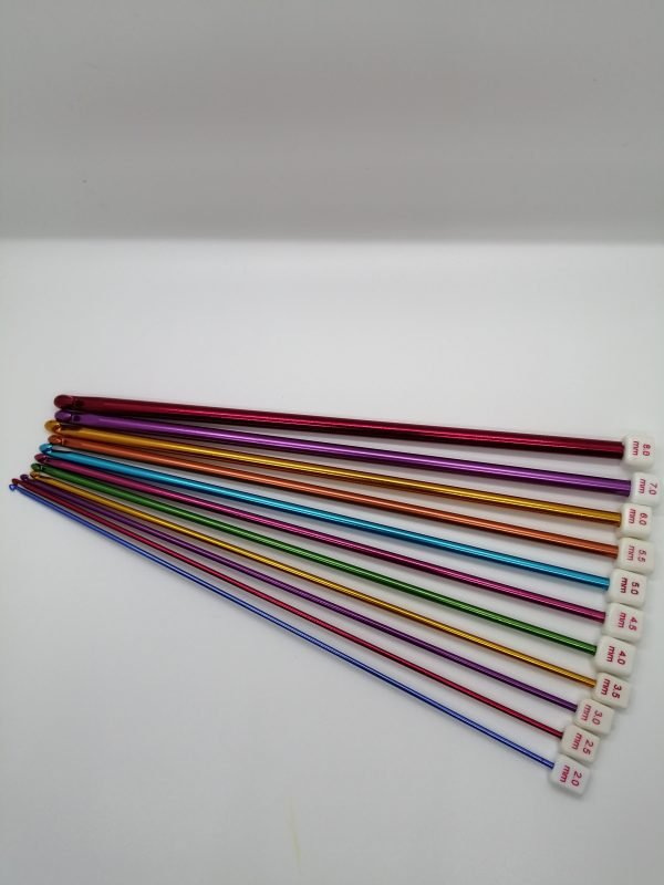 These assorted color Tunisian afghan crochet hooks are made of aluminium material and the sizes range from 2 to 8 mm, the hook length is 10.6 inches/27 cms. This hook set is suitable for Afghans, blankets, rugs and scarves.
