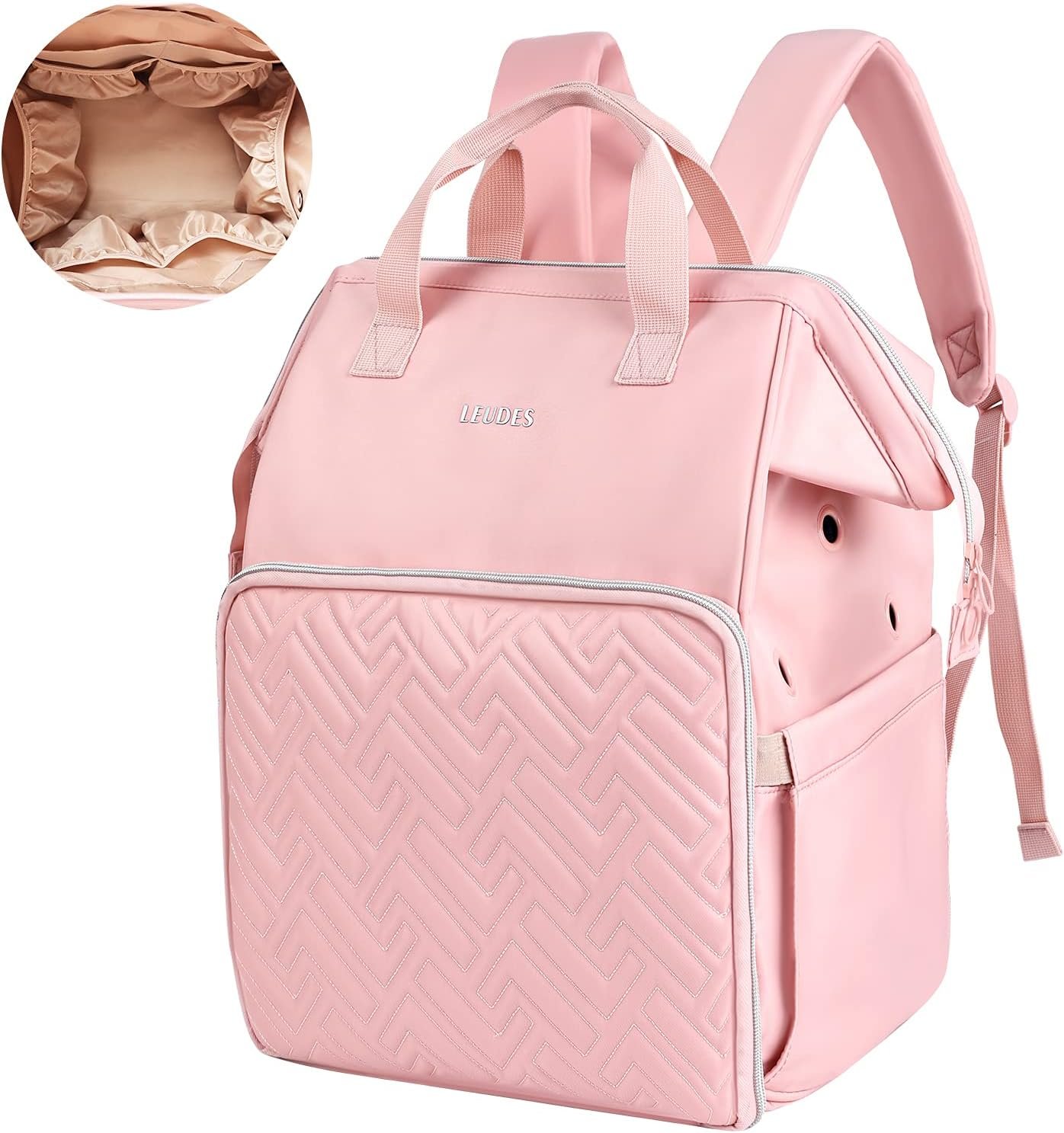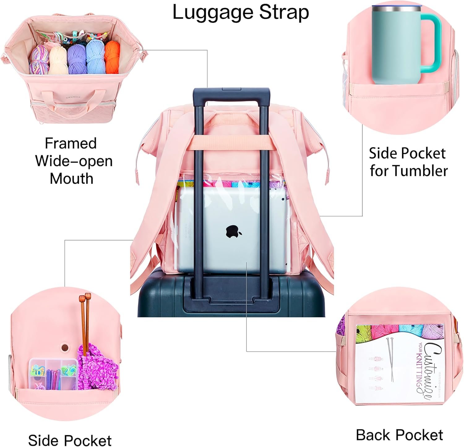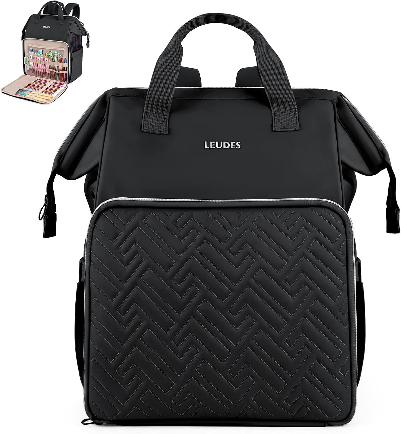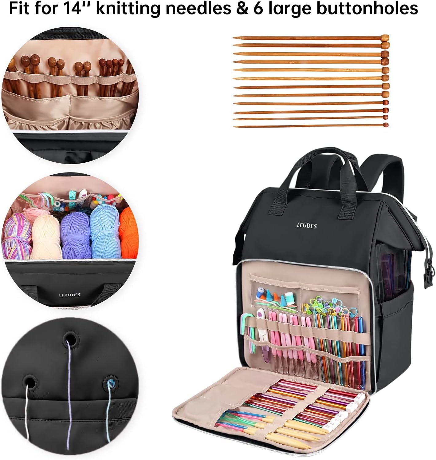 There are 2 inner pockets with elastic straps fit up to 14” knitting needles and 3 clear PVC inner pockets allow you to put your daily necessities. Front pouches and elastic loops for crochet hooks and accessories, side pockets for water bottle or umbrella and back pouches to store the ultimate guide, knitting supplies, iPad and more.